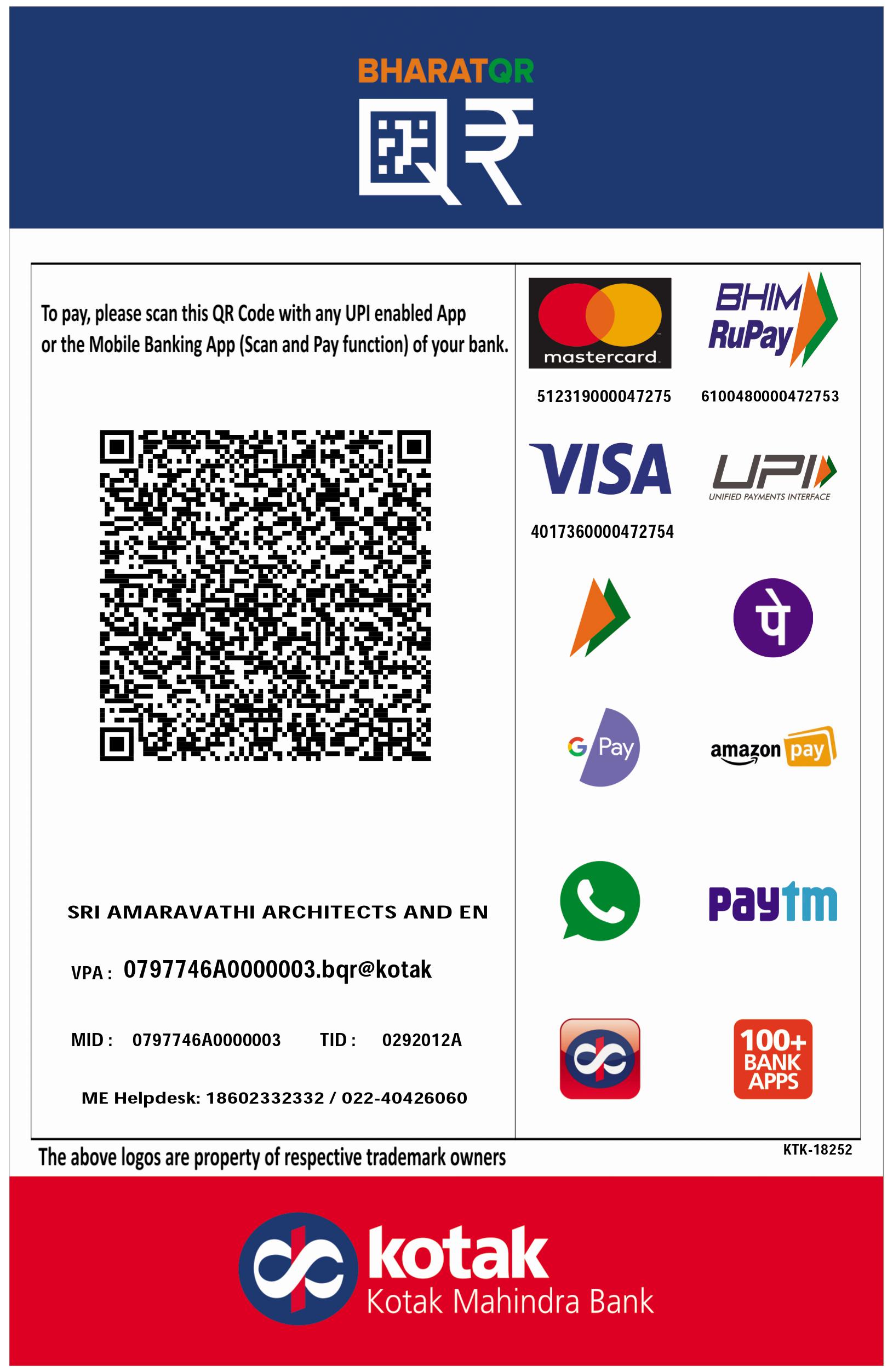 Account holder name: SRI AMARAVATHI ARCHITECTS & ENGINEERS Payment method: FAST / GIRO / MEPS Account number: 885414442102 BIC/SWIFT code: DBSSSGSG Bank name: DBS Bank Limited Beneficiary address: 12 Marina Boulevard, Marina Bay Financial Tower 3, Sing apore 018982